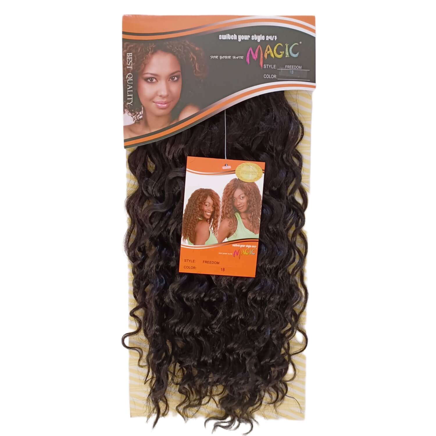 Magic Freedom is a curly weave on hairpiece. Two packs are required to complete the style.